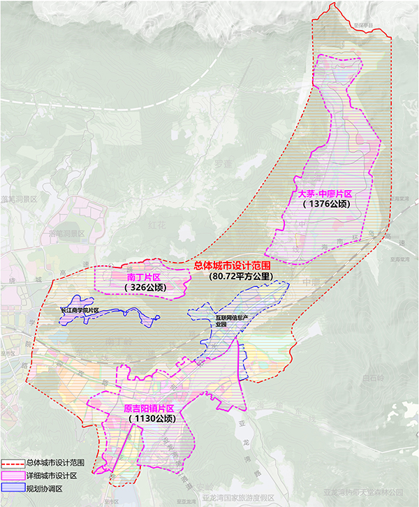 詳細城市設計包括3個片區,總面積約2832公頃。其中,原吉陽鎮片區面積約1130公頃,南丁片區約326公頃,大茅-中廖片區約1376公頃(詳見規劃范圍示意圖)。