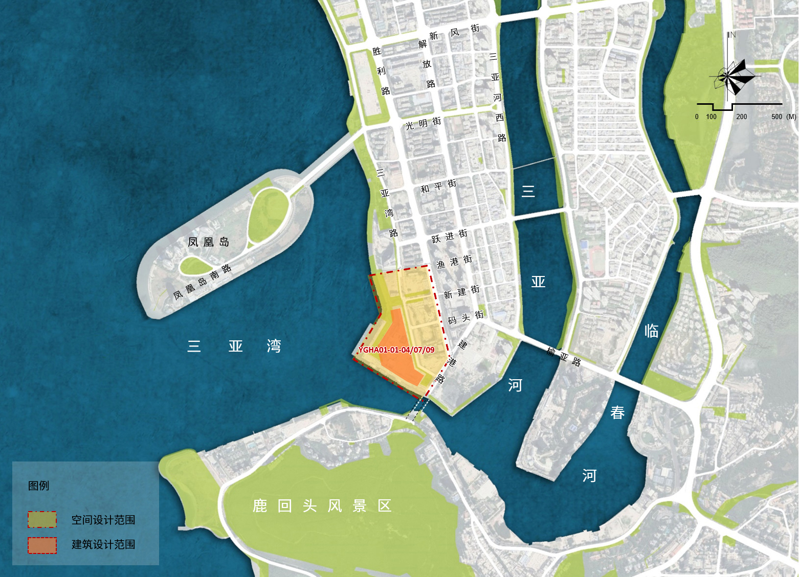 1.項目地點:三亞文化商務區(空間設計范圍)位于三亞灣鳳凰海岸南端,三亞河口區域,北至漁港街,南至建港路,東至勝利路。三亞國際藝術港(建筑設計范圍)位于三亞文化商務區YGHA01-01-04/07/09地塊。