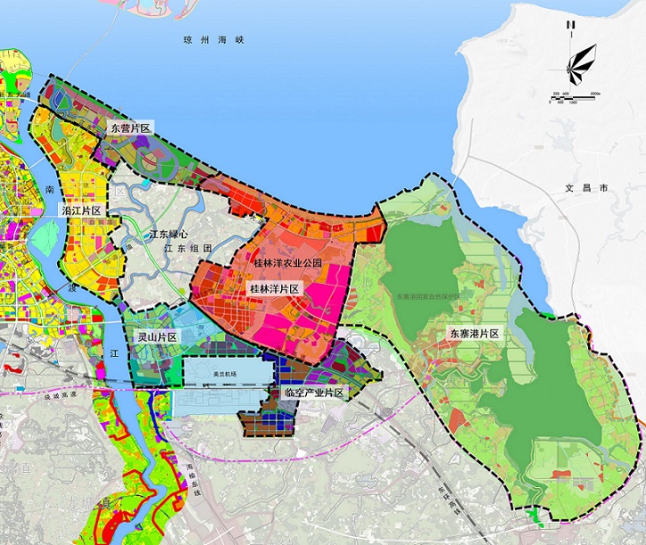 江東新區位于海口東海岸區域,東起東寨港(海口行政邊界),西至南渡江,北臨東海岸線,南至繞城高速二期和212省道,總用地面積約298平方公里,分為東部生態功能區和西部產城融合區。其中東部生態功能區約106平方公里,包含33平方公里的國際重要濕地東寨港國家級自然保護區;西部產城融合區約192平方公里,包含沿江生活片區、桂林洋高校片區及臨空產業園片區等。